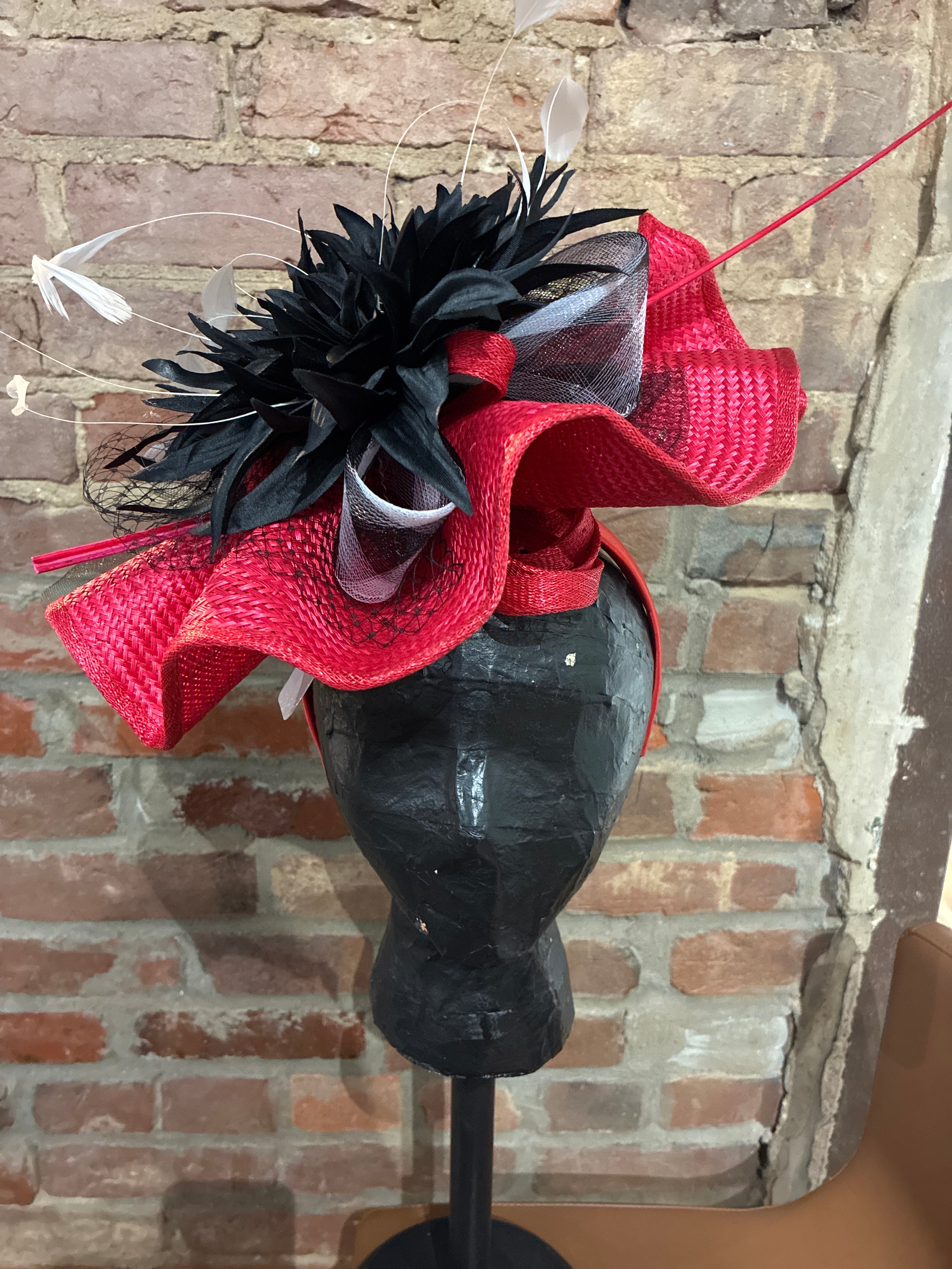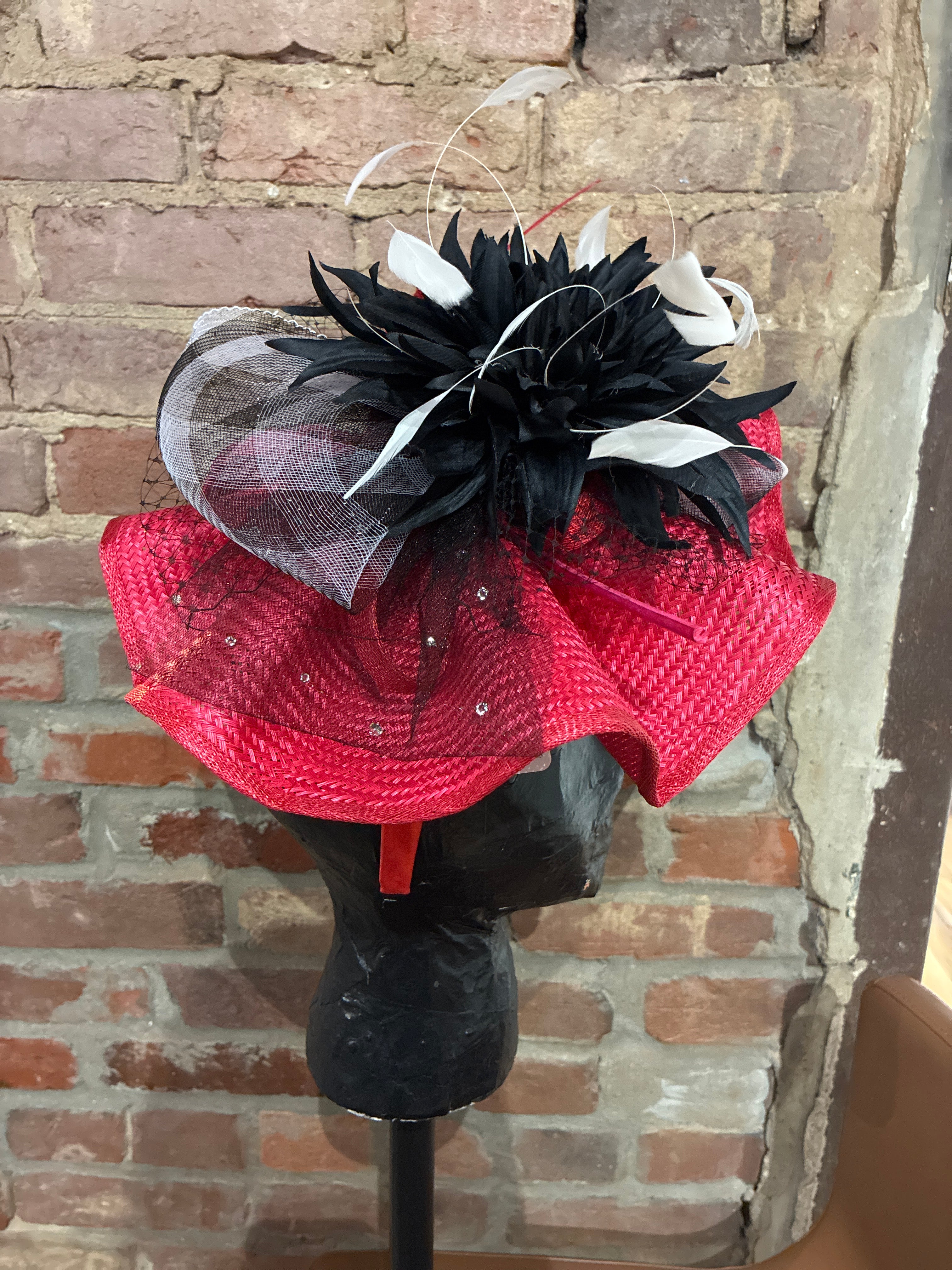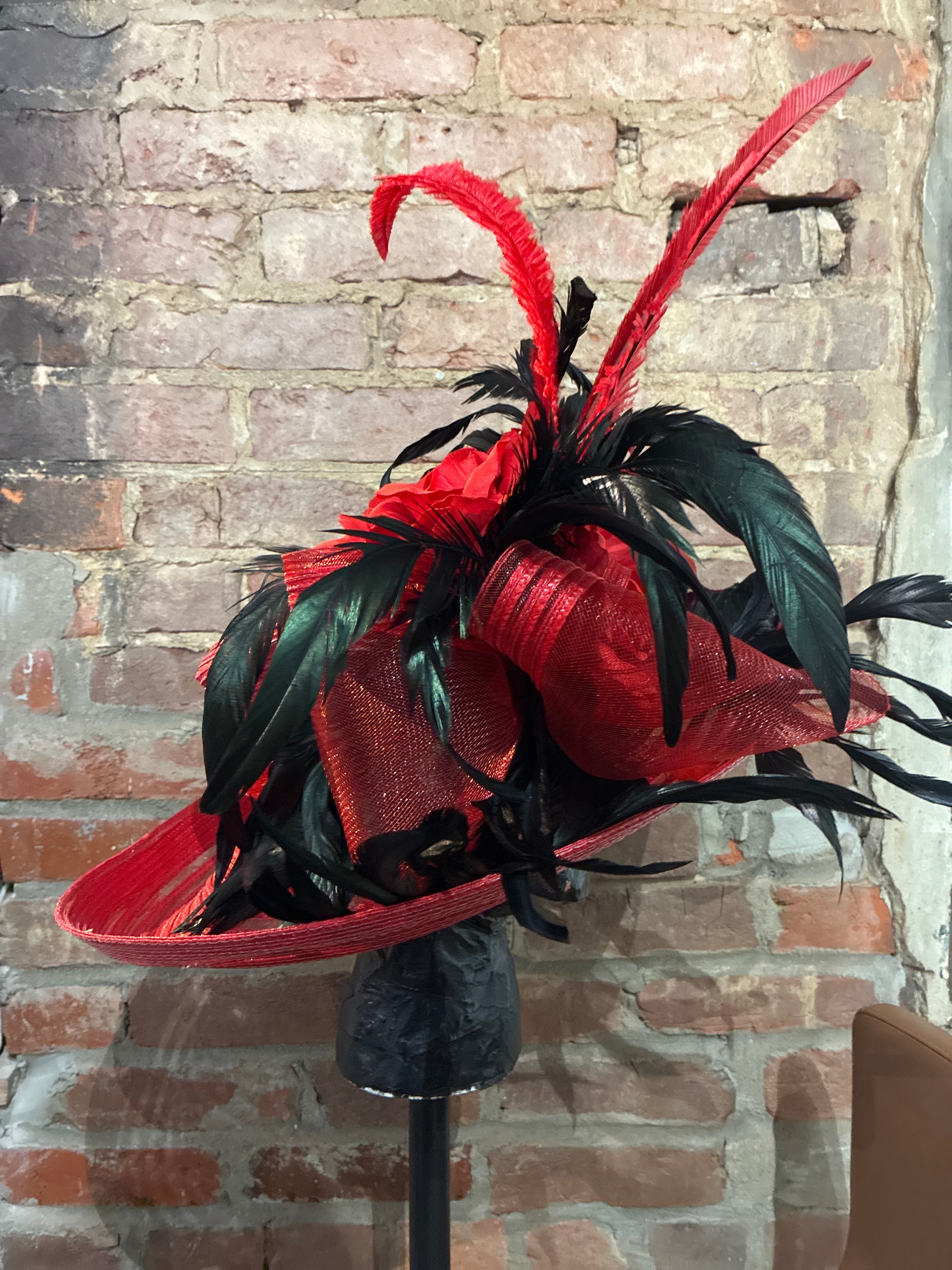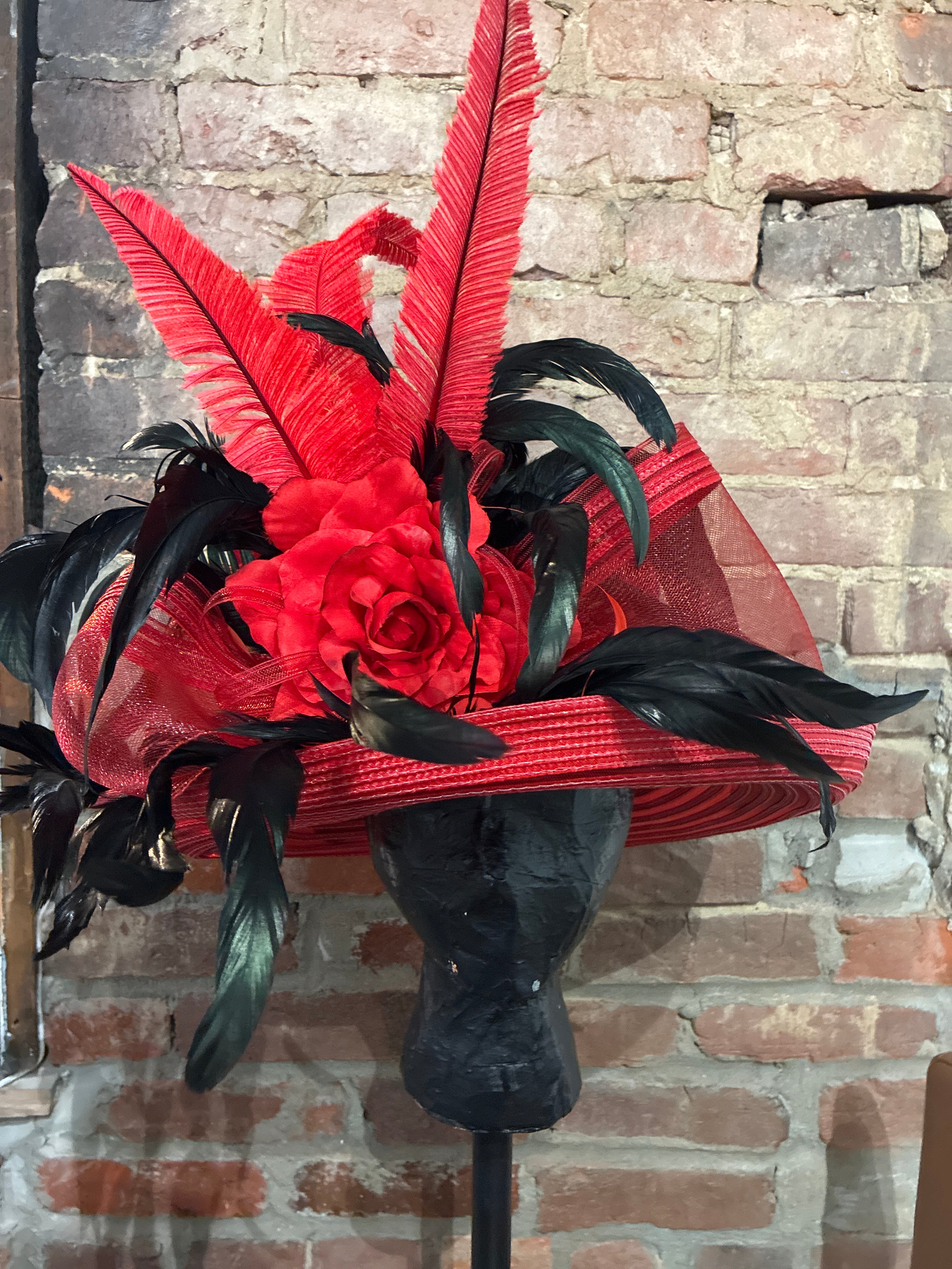 One of a Kind Red Derby Hat with Black Feathers