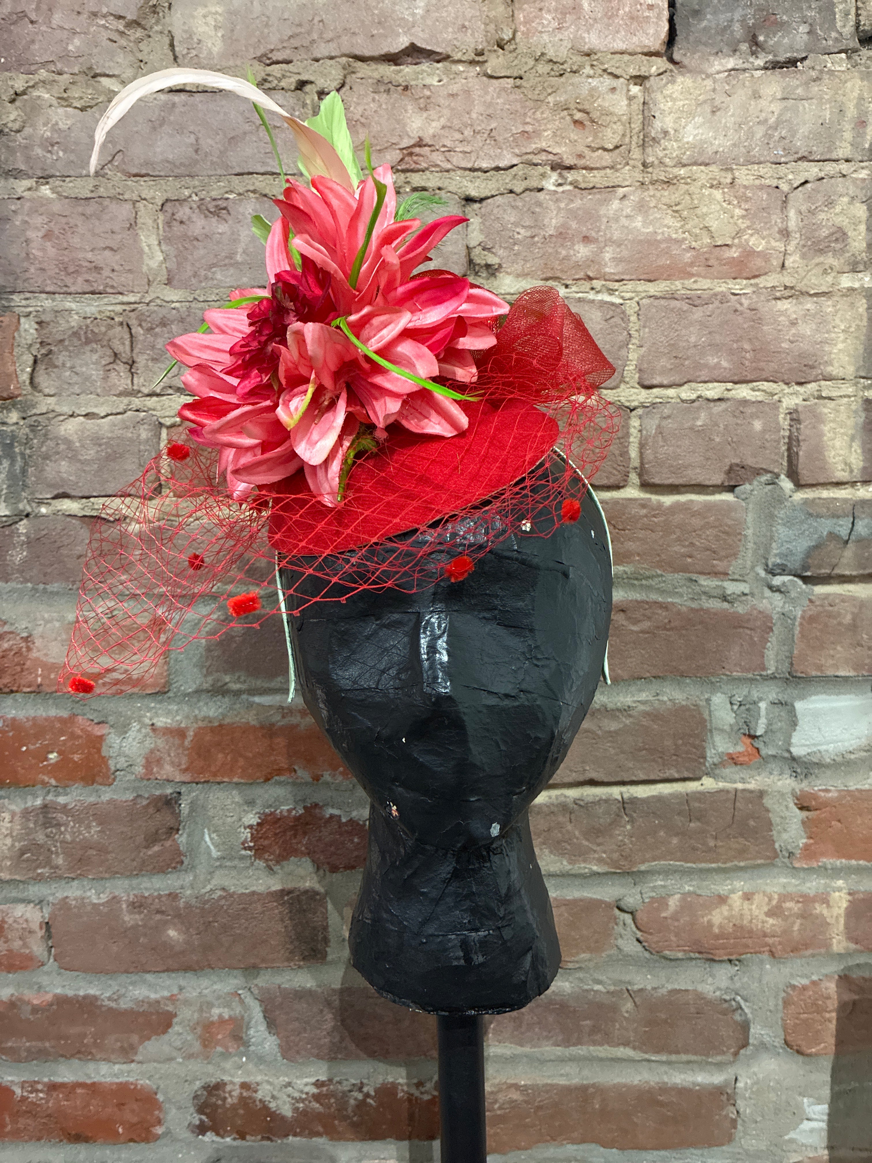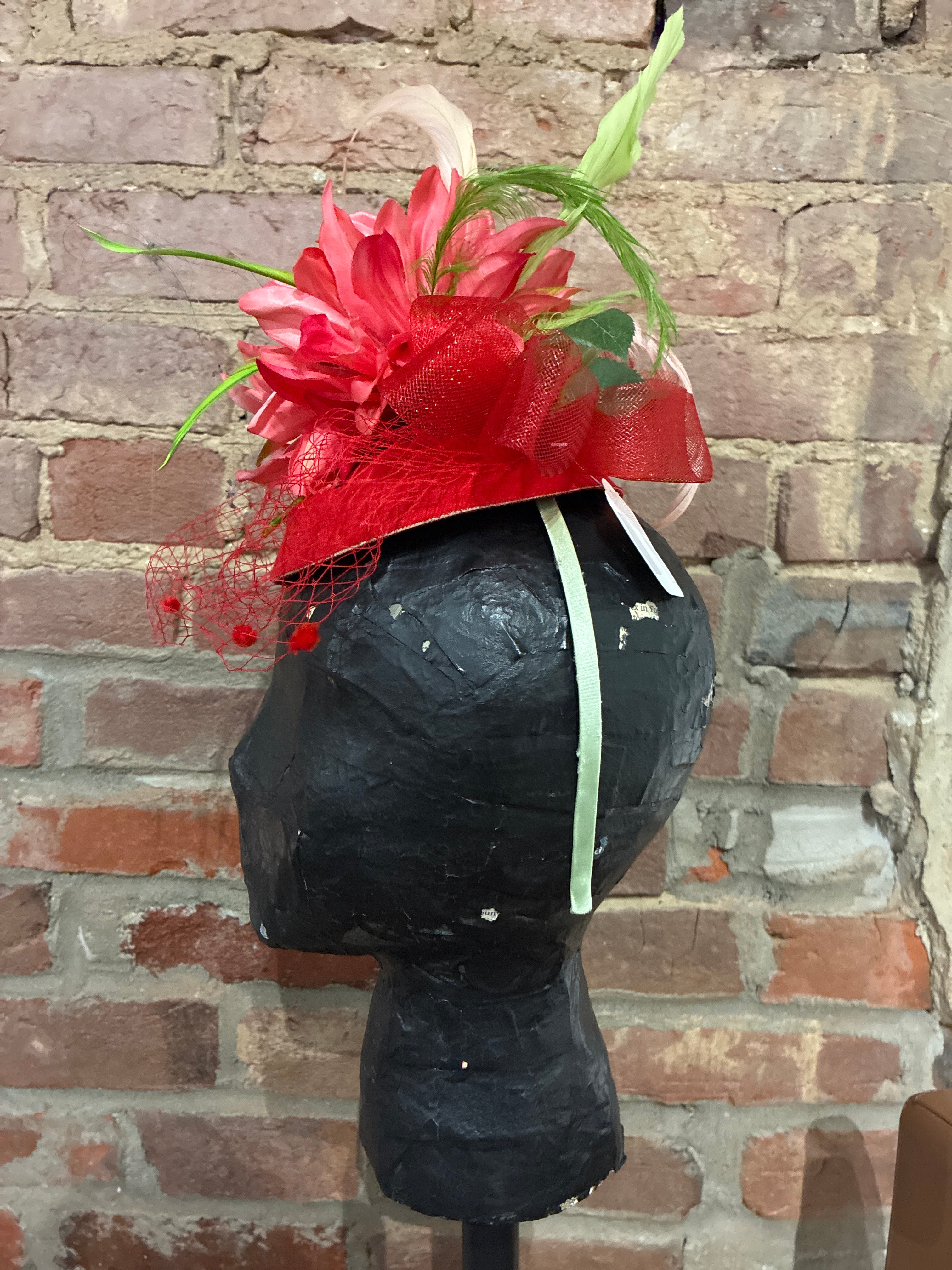 Red Custom Fascinator with Green Details